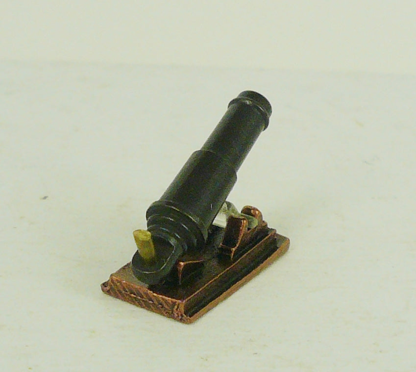 C-5 Corel Carronade - 24mm (31/32") Burnished and blackened cast metal w/ aiming mechanisms. The tilting mechanism beneath the barrel is clear molded vinyl. The simulated elevator screw is a piece of brass rod. All in all a delightful little piece of artillery for your warship.
