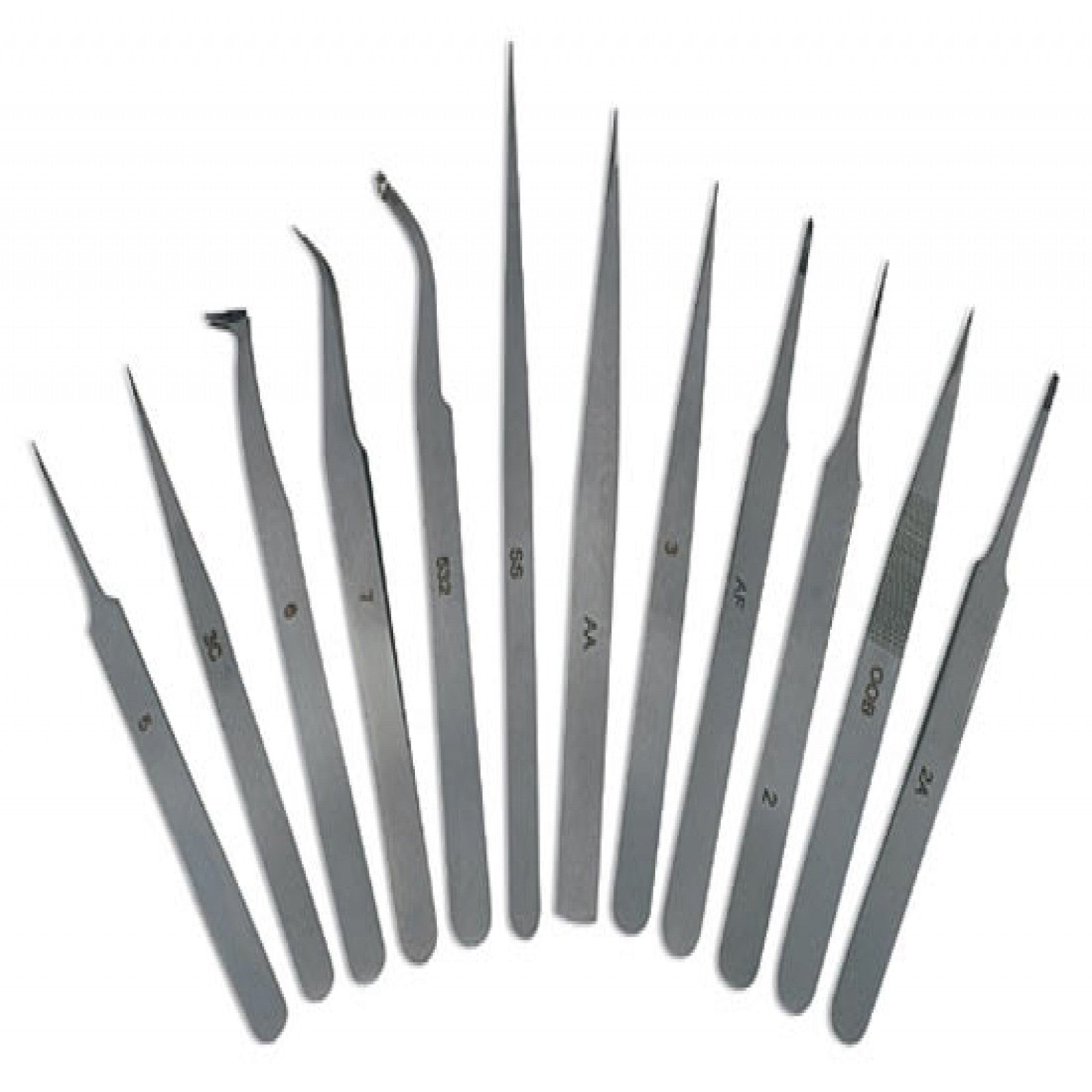 12-piece set of stainless steel anti-magnetic tweezers offers complete variety for any job. Ground and polished to perfection, set has a nice touch for fine work. Points are exactly aligned for a firm grip on the smallest parts. Sizes range from 4-1/2" to 5".