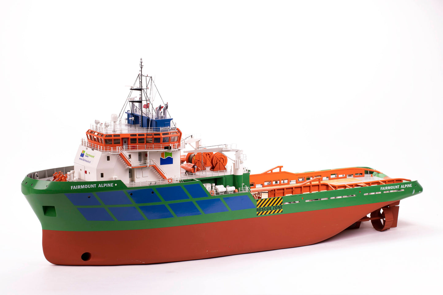 In order to meet the highest quality standards imposed by its world-wide clientele Fairmount Marine ordered no less than five new 205 tons bollard pull long distance towing vessels with anchor handling capacities from the Niigata Shipyard in Japan. Of this series, in May 2005 the 205 tons bollard pull FAIRMOUNT SHERPA was delivered and added to the fleet, in October 2005 sister vessel FAIRMOUNT SUMMIT and in May 2006 sister vessel FAIRMOUNT ALPINE, the largest and most powerful tugs ever built for Dutch interests, followed. In July 2006 FAIRMOUNT GLACIER was delivered to Fairmount Marine. The fifth super tug in the series, FAIRMOUNT EXPEDITION, has been delivered in May 2007. The Fairmount’s main activities are long distance ocean towage and salvage, with its fleet of five tugs of 200 tons bollard pull, the transportation of heavy lifts by semi-submersible barges and the worldwide activities of Fukada Salvage with its modern fleet of offshore support vessels and floating cranes. Fairmount operates a fleet of ultra strong long distance towing vessels, semi-submersible barges including the world's largest unit the 50,000 dwt GAVEA LIFTER and multipurpose offshore support vessels.Scale 1:75