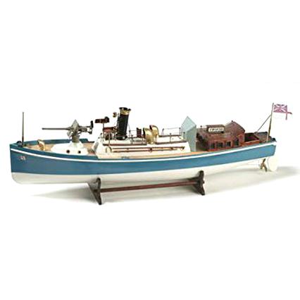 In the mid 1800's, the Royal Navy began to equip its larger men-of-war with so-called steam barges or steam pinnaces. After experiments with a number of different types, 30, 40, 50 and 56 ft boats became most widely used. By the end of the century, the first motor pinnaces were ready for duty. When the First World War broke our, however, steam boats returned to the scene. The 50 ft pinnace for 'HMS Renown' dates from this period. As many as 4 of these boats other man-of-war. The boats had a small forepeak, a crew compartment, a boiler room and a cabin. Above the crews' quarters was a conical steel base with a permanent universal ring, on which a 3-lb quick-firing cannon or maxim machine gun could be mounted.