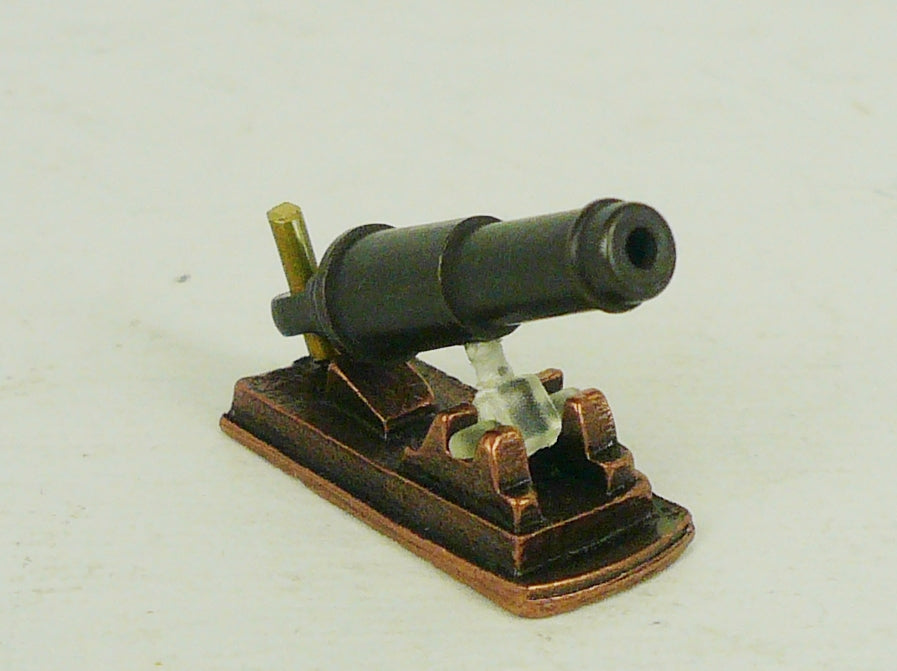 C-5 Corel Carronade - 24mm (31/32") Burnished and blackened cast metal w/ aiming mechanisms. The tilting mechanism beneath the barrel is clear molded vinyl. The simulated elevator screw is a piece of brass rod. All in all a delightful little piece of artillery for your warship.