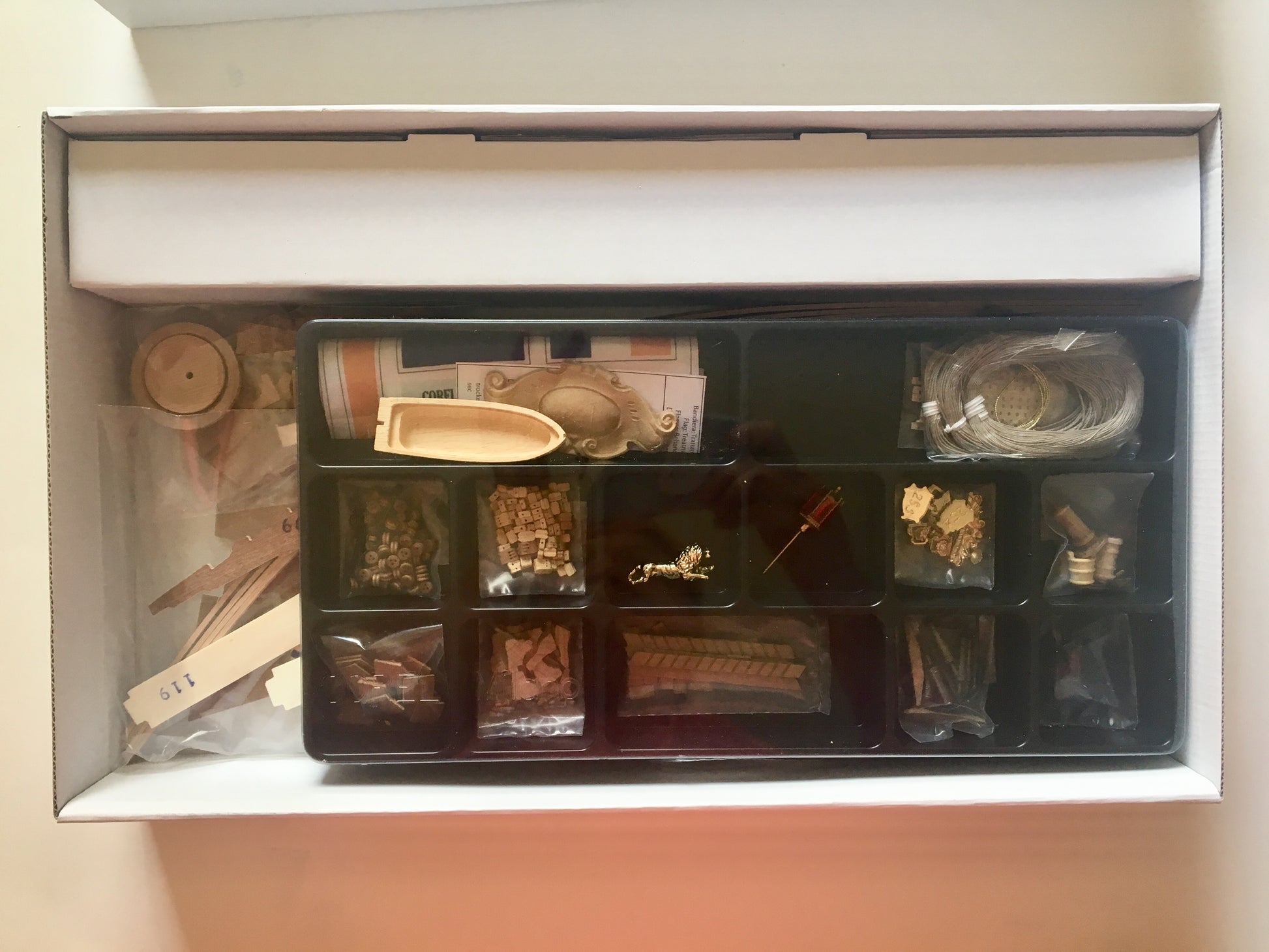 A delightful plank-on-bulkhead reproduction of Henry Hudson's historic vessel! Laser-cut wooden components are poplar and mahogany, dark walnut, limewood, tanganyka and beech. The decorative strips along the bow and stern are intricately inlaid - not painted - wood. The hardwood, brass and gilded metal fittings are of excellent quality. Kit includes ten sheets of plans and clear instructions.