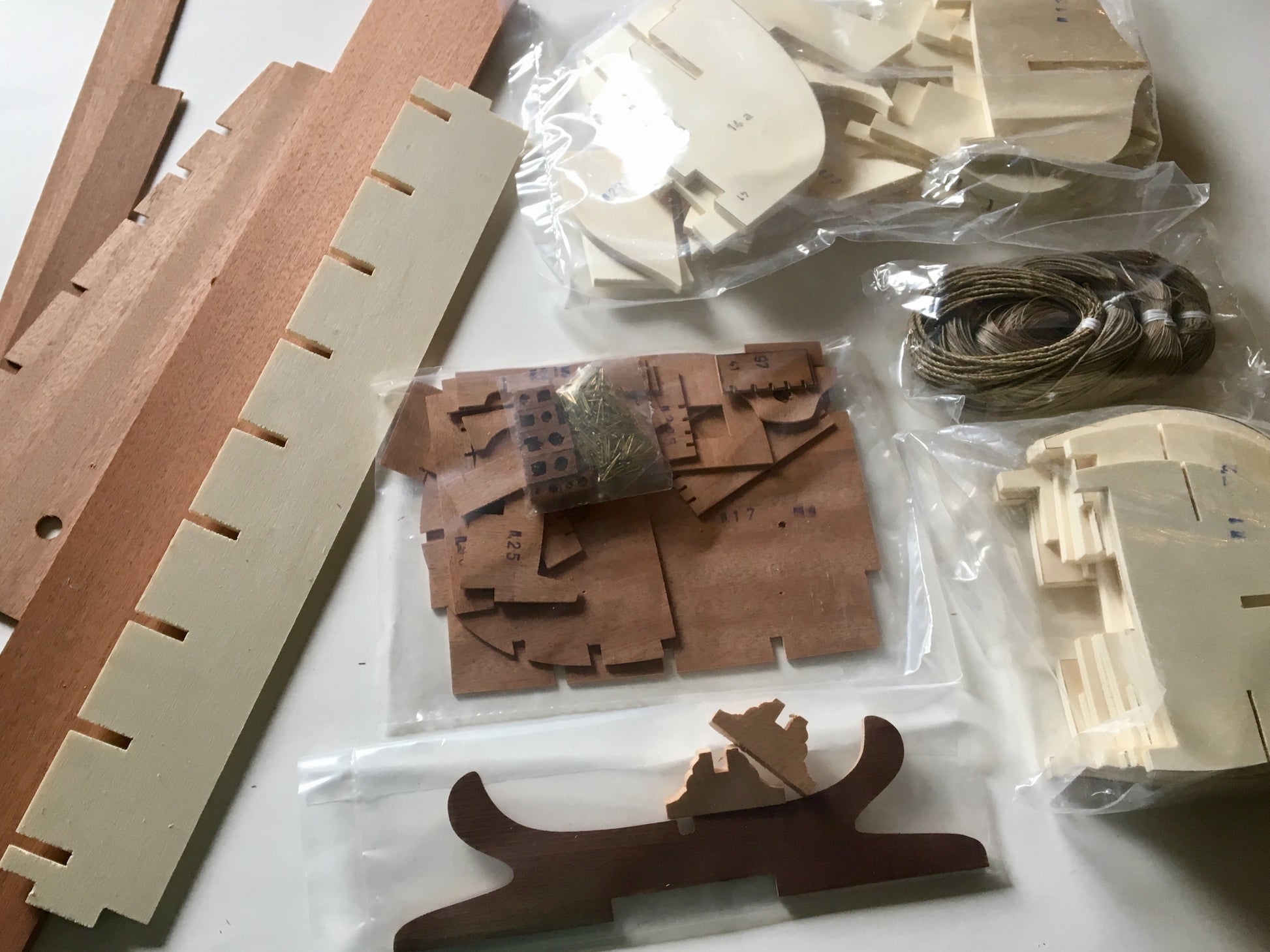 Corel's kit features plank-on-bulkhead construction with laser-cut frames and keel. Poplar, walnut, basswood, tanganyka, mahogany, maple and beech are used throughout. Kit includes brass and hardwood fittings, rigging, silk-screened flags and display cradle. Plans and instruction book have been revised for easier construction.