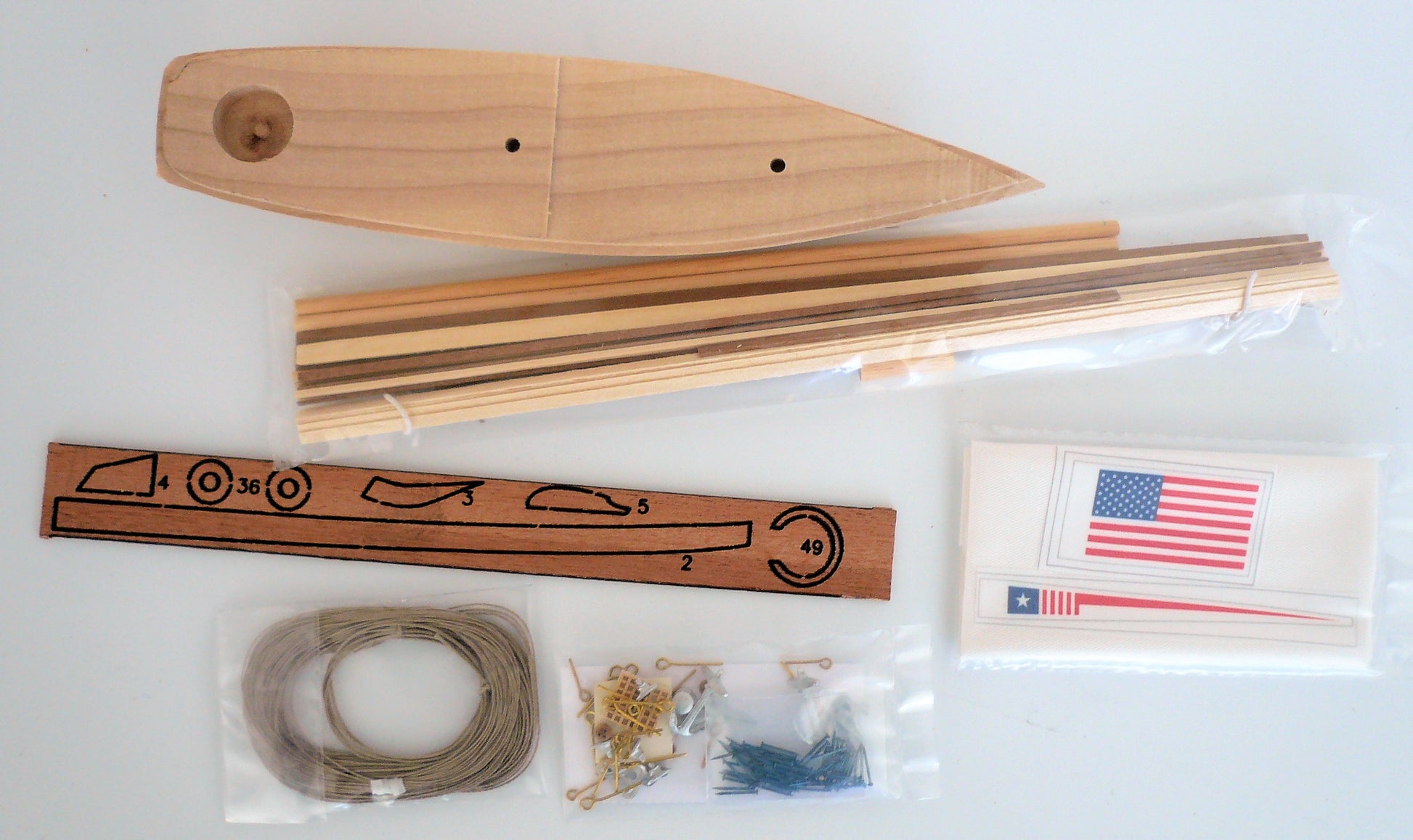 Kit consists of a near-perfect hull only requiring a bit of sanding; 3 diameters of rigging rope, laser-cut deck and transom parts, cast metal fitting including anchors and brass eyebolts. Beech strips are destined for deck planking. A cloth screen-printed flag tops off the mast and a cradle with name plate allows you to proudly display your creation.