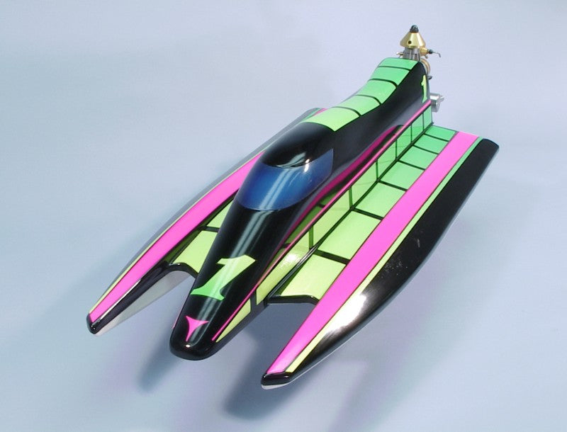 This 24 in. tunnel hull is a water ripper that is sure to please everyone, beginner and pro alike. This kit features precision die-cut plywood con-struction and a preformed ABS cowl. Step by step instructions with lots of photos and a complete plan set that makes building a SNAP. We have even included the building jig, complete steering and throttle linkage in the kit! You’re two feet ahead of the competition with the Dumas HOT SHOT SPRINT 3.5. Power: 3.5cc size gas marine outboard engine Running Hardware: Not required for outboards
