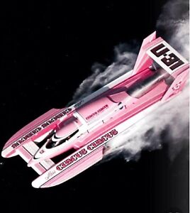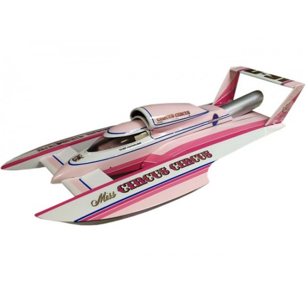 Feel the adrenaline rush and your pulse quicken as you punch the throttle on this MONSTER OF SPEED AND PERFORMANCE. You will feel the Gs as you scream around the turns and thunder down the straightaways. Your .67 gas powered Miss Circus Circus hydro may be more excitement than you can handle. With a pre-formed center section and premium die-cut plywood construction, your Circus Circus will seem to materialize on your work bench. Three shades of hot pink and ice white make a color statement that no one can ignore. A complete set of lettering and logo decals will add the finishing touches to your model. The Circus Circus uses Dumas flex cable drive running hardware kit #2346. Dumas engineered this kit to make you look like a pro both on and off the water. Motor Not Included