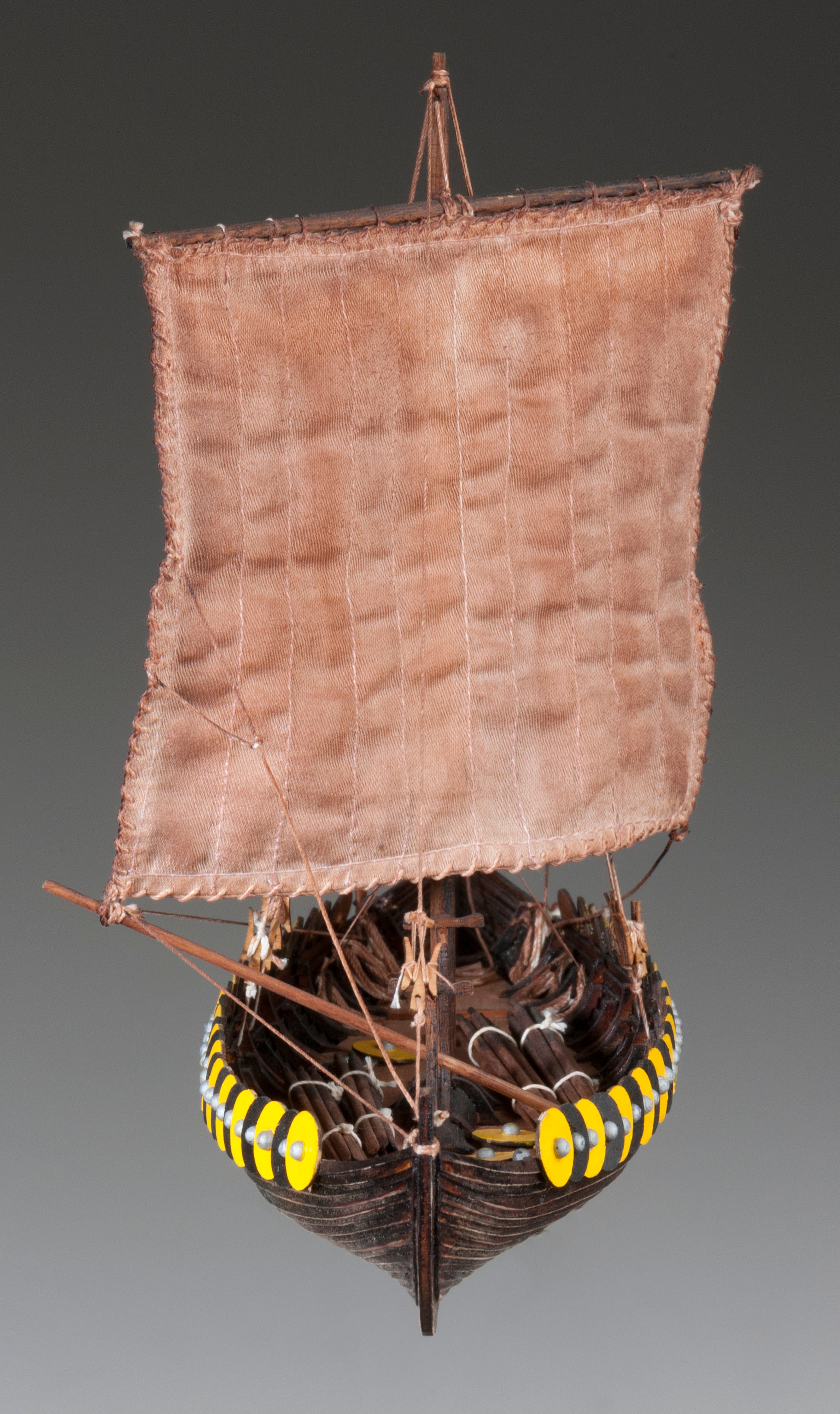This model represents a Viking ship found in the year 1880 near village Gokstad in Norway. The ship was built in the second half of the ninth century. The excellent nautical ability of the ship was demonstrated in the year 1893 when a replica built by Magnus Anderson took a journey from Norway to the USA. The total length of the ship was 24 meters. The keel and planks were made from oak wood. The ship was propelled by 32 oars and one rectangular sail.