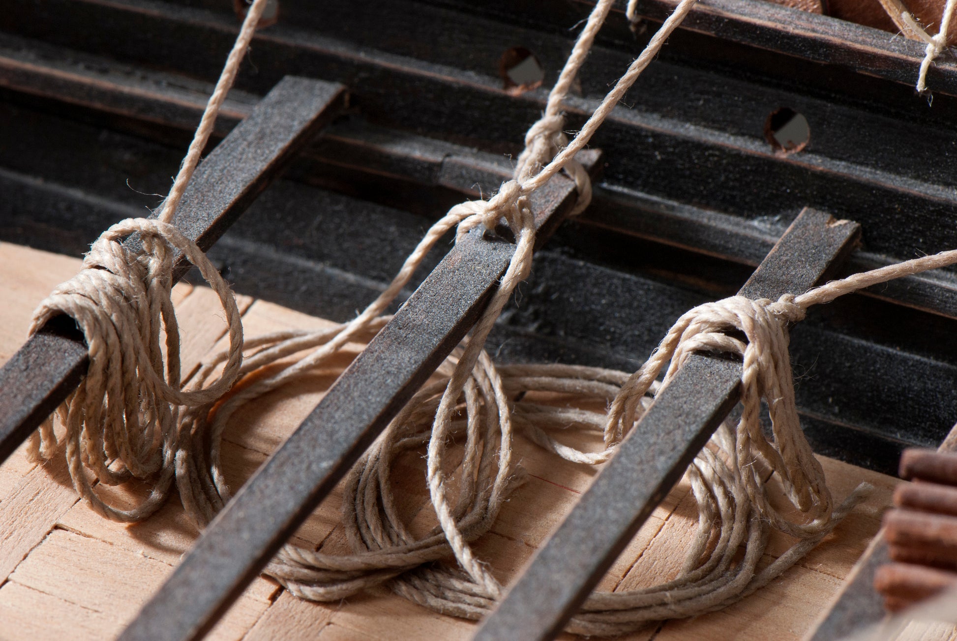 This model represents the similar long ship which was found near the village of Skuldelev at Denmark and which is known as Skuldelev 2. The original was constructed primarily of oak wood about the year 1060 in Dublin. The ship had a length of 30 meters and width of 3.8 meters. The ship could sail with 60-100 Viking warriors onboard and was driven by a large rectangular sheet. In the case of no wind, there were 60 oars.