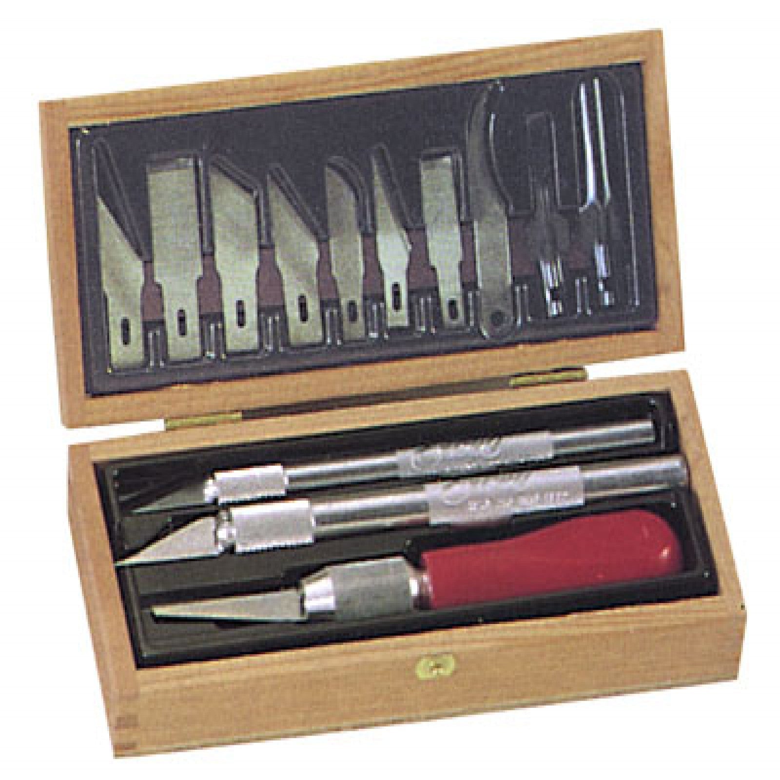 Contains K1 light duty knife, K2 medium duty knife, and K7 woodcarving knife, plus 10 assorted gouges and blades - all stored in a wooden box. Use for cutting, gouging, carving and more!