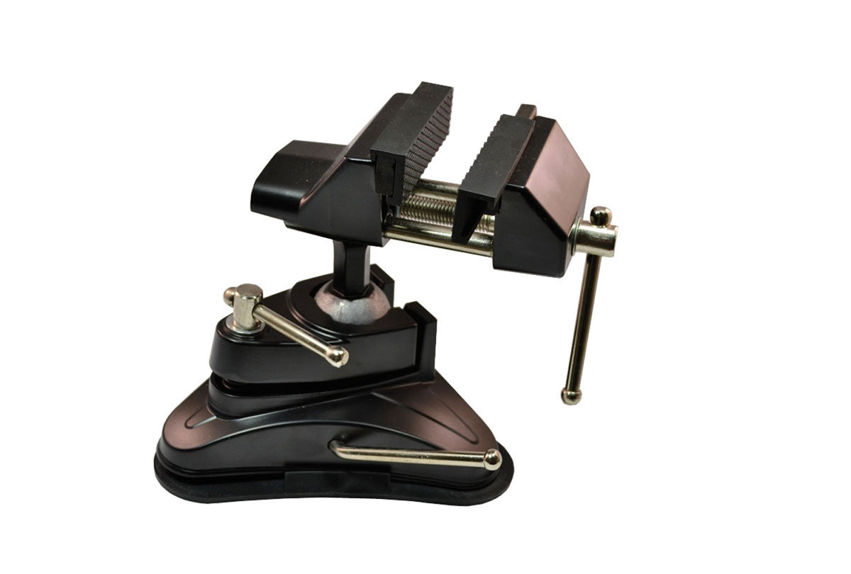 Completely portable, attaches instantly to any smooth, non-porous surface. Large 3? (76 mm), V-grooved, iron jaws open to 3? (76 mm) with precision screw action. Universal ball joint rotates vise to any desired working angle. Includes a set of protective rubber jaws.