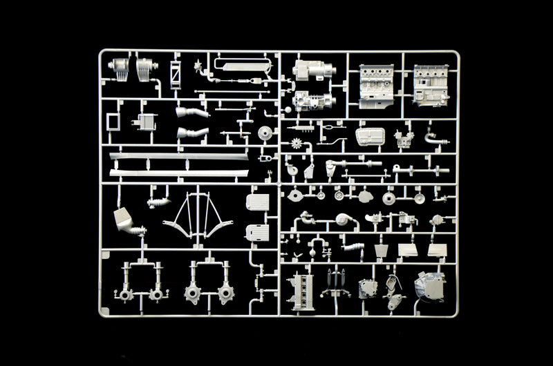 100% new moulds highly detailed model - 2 super decals sheets - Photo-etched fret and chromed parts - Accessories set with hoses, screws and springs - Front and rear opening bonnet - Opening front doors - Highly detailed interiors - Engine bay faithful reproduction - Working suspensions - Rubber tyres - Steering wheels