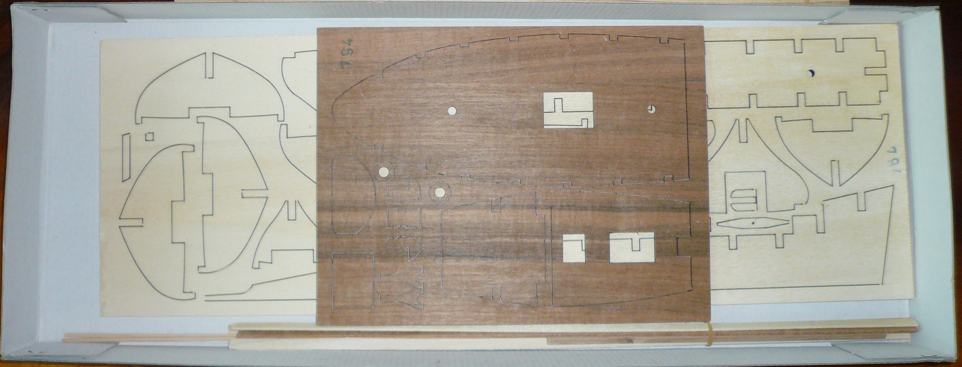 An ample fittings package includes walnut blocks and deadeyes, cast white metal cleats, anchor and bollards, brass capstan, belaying pins, chain-plates and photo-etched brass sheet for windows plus many other life-like details. Three diameters of rigging line, silk-screened cloth flag and nameplate finish your impressive model. Detailed plans are two huge sheets, accompanied by four pages of English step-by-step and a parts list. Over-all length of finished model is 22-1/2". Length of hull is 14".