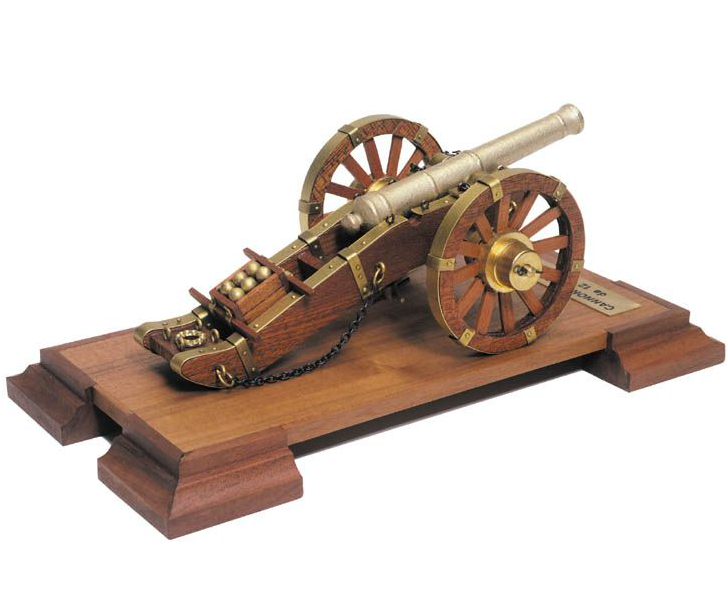 Kit features laser cut basswood and walnut parts for the base. Also includes a metal cannon barrel, nameplate plus life-like accessories, including cannon balls.