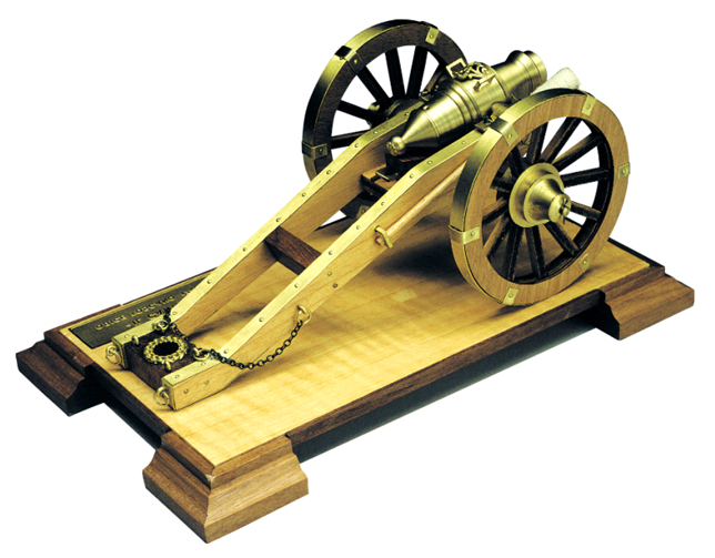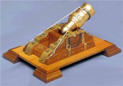 Kit features laser cut basswood and walnut parts for the base. Also includes a turned brass barrel plus life-like accessories, including cannon balls, rope and nameplate.