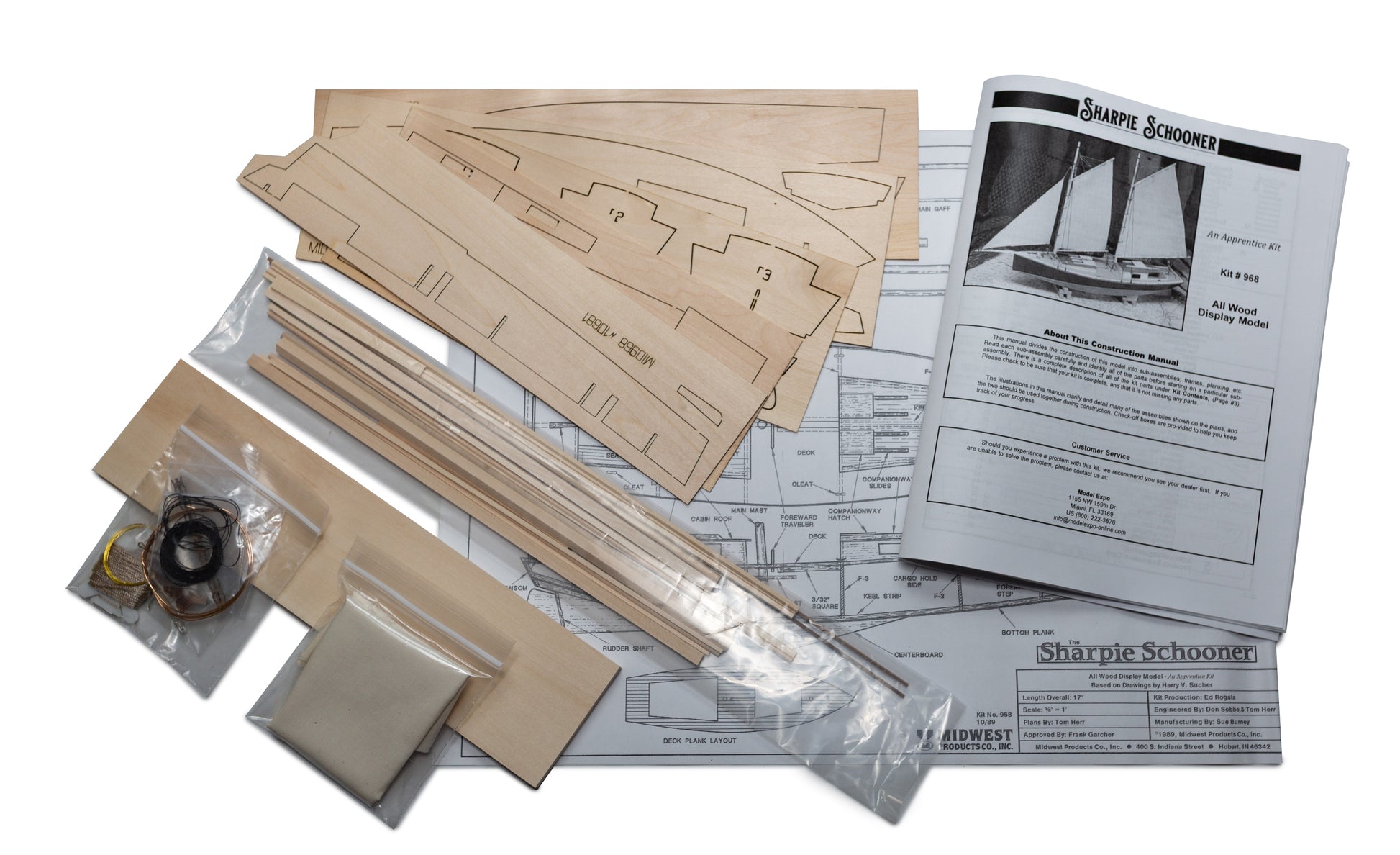 Complete fittings set which includes cotton material for sails, rigging cordage, blocks, cleats, cast Brittania anchor, anchor chain and brass wire. No extras to buy!