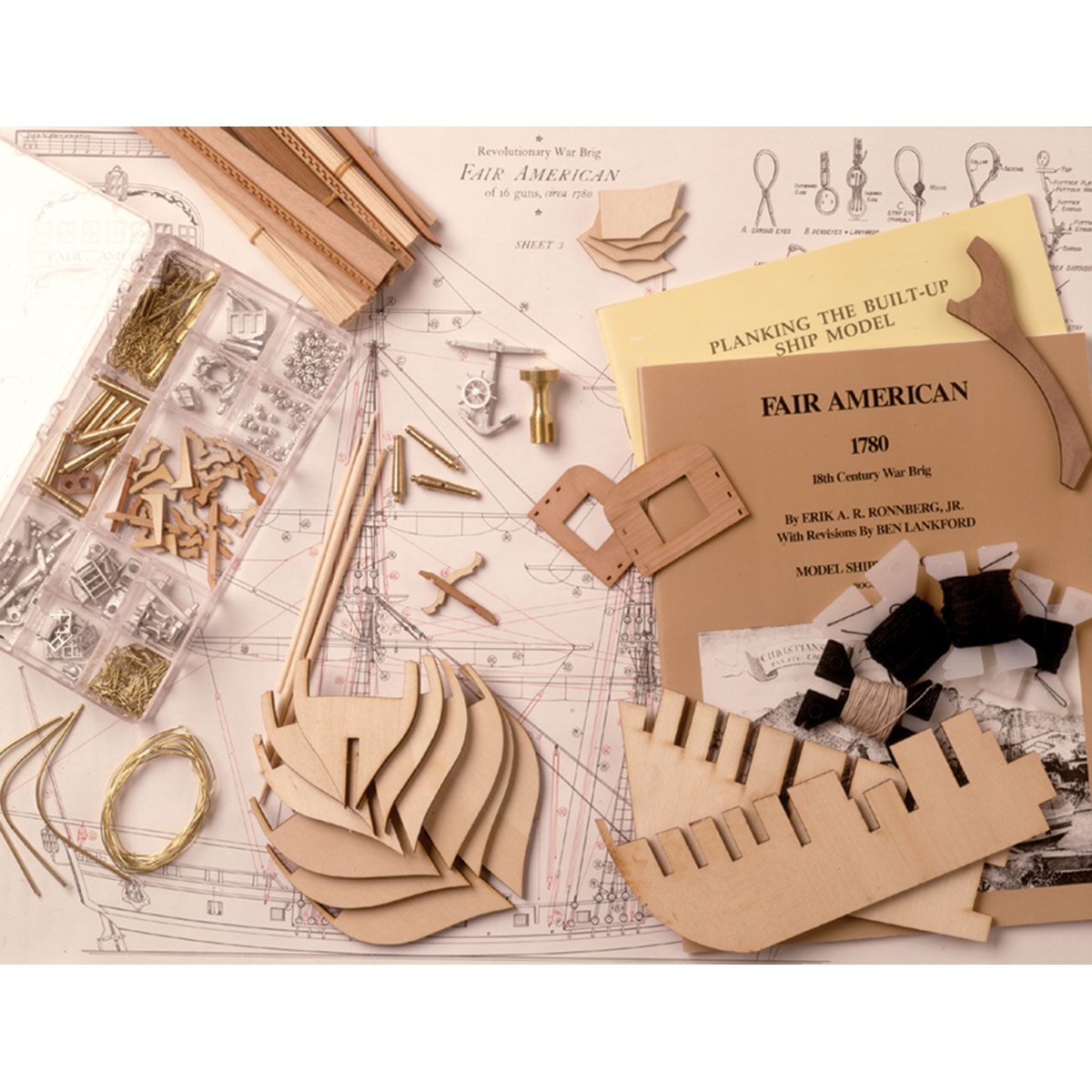 Model Expo - ' kit of the Revolutionary War brig Fair American is based on Model No. 60 in the Henry Huddleston Rogers ship model collection at the U.S. Naval Academy Museum, Annapolis, Maryland. The model's origin is uncertain: one claim asserts that the model was made by the British Admiralty after the vessel's capture to study her fine hull form and enormous rig; another faction has argued that the model was made in America and subsequently used as a guide for a painting of a naval engagement involving the original brig. All that is certain is that the model was in English hands prior to its acquisition by Colonel Rogers and one can only wonder how the model got there if it had been made in America during the turbulent post-Revolutionary period, and by whom, assuming time, money, and talent were available for such an involved undertaking.
