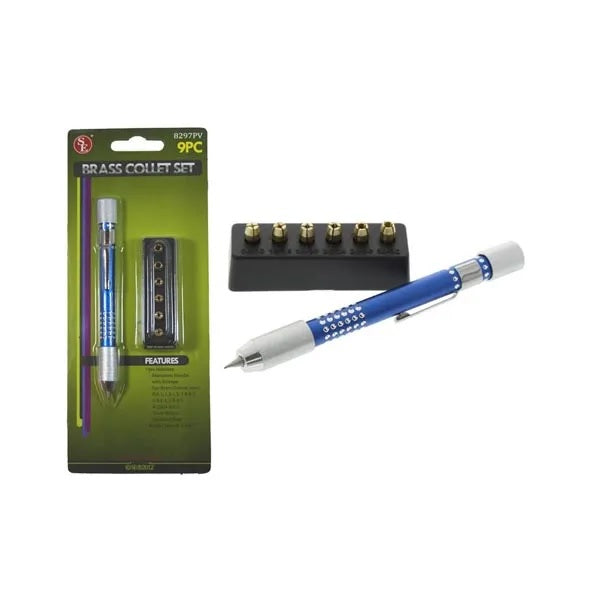 The Sona 8297PV Brass Collet Set (9 PC.) includes 7 different pieces of brass collets. It also includes an aluminum handle with storage. This set is great to use with bead reamers, diamond burrs, files, HSS drills, and more.