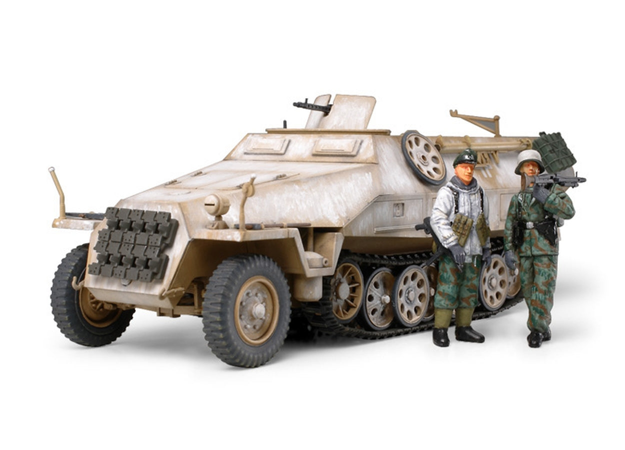 During WWII, German armored divisions effectively used Hanomag half-track armored carriers in transport and support roles. Among the many variations was the Sd.Kfz. 251/1 Ausf.D which first appeared in 1943 and is now faithfully depicted as a plastic assembly model kit. The features of the distinctively styled Ausf.D which includes the open top cabin, seats, and wireless radio have been realistically reproduced in great detail. The rear gate can also be depicted in either open or closed position. Included with the Ausf.D are 4 figures in dynamic poses such as the driver looking back from the driver's seat as well as the commander showing the direction of the enemy. In addition, weapons such as a Panzerfaust and MG42 machine gun are included with the kit for added realism.
