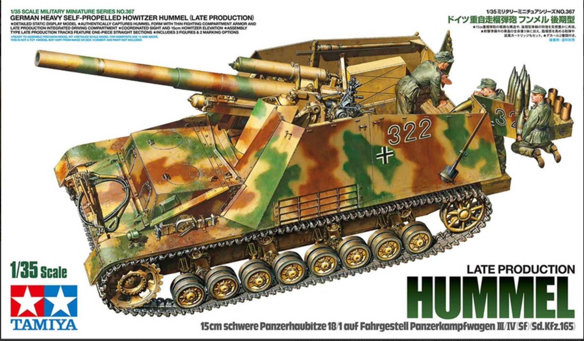 This TAMIYA model recreates the German WWII self-propelled gun Howitzer Hummel (Late Production). Its name translates to ÒbumblebeeÓ. The Hummel was designed to fulfill demand for mobile artillery support for German tank units. Based upon the GeschŸtzwagen III/IV (also used on the Nashorn), it sported an L/30 15cm howitzer and open top fighting compartment. Hummels were designed in 1942 and debuted on the Eastern Front in 1943; they were also seen in North-West Europe and Italy in the latter half of WWII.