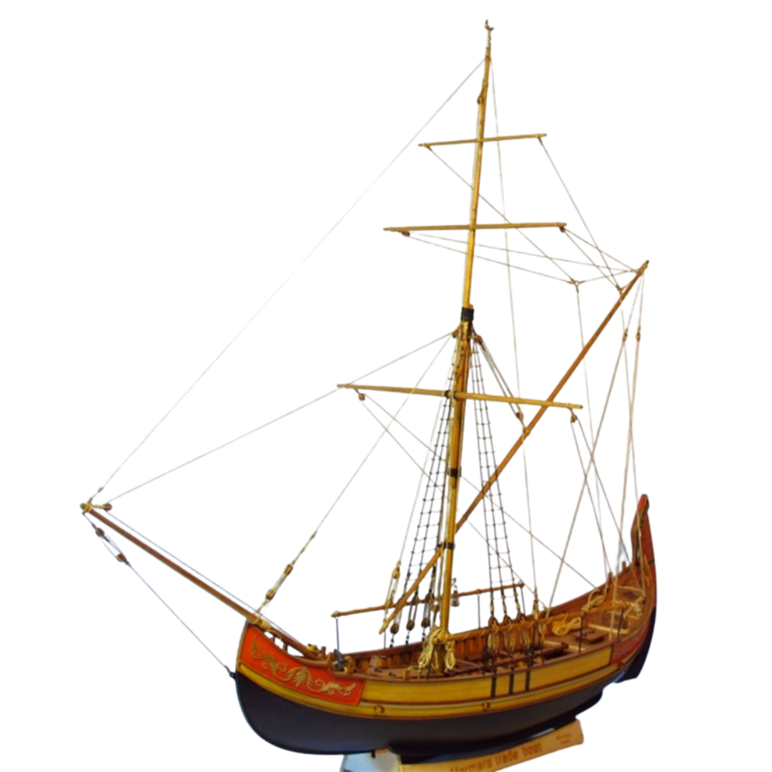 The Marmara is a model of an Ottoman coastal trade ship that conducted marine trade and fishing in the waters of the Sea of Marmara, Dardanelles Strait, and Bosphorus Strait in the 16th-19th centuries. These craft had a rig consisting of square sails, Bentinck (triangular) sails and a sprit sail and were typically 15m to 20m in length. The ends alone were decked; the open cargo hold was protected by canvas. The sides were decorated with moldings and arabesque carvings, and a large, curved rudder with its ornately decorated tiller probably required the crew to assist the skipper to steer in a stiff breeze. The skipper wearing a fine Turkish costume of long ago added to the visual impact of these picturesque boats. The seams of the canvas, wider at the bottom than the top, gave the sprit sail a rounded balloon shape, more elegant in design than efficient for sailing against the wind.